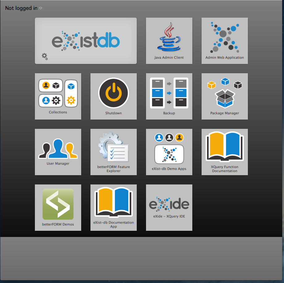 After a successful installation and launch, access eXist-db's Dashboard, the central administration and application hub of eXist-db. If the system tray icon works on your system, select Open Dashboard from the pop-up menu. Or just open a web browser and enter the following URL: http://localhost:8080/exist/