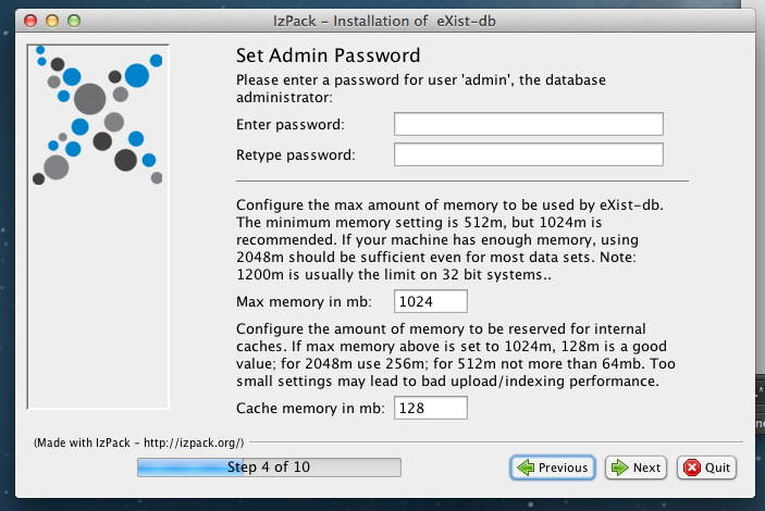 The Admin Password is a password for the eXist-db administrator account, or more commonly, the "admin" account. This admin account belongs to you, and certain key functions in eXist-db can only be performed by the admin. While you can leave the admin password blank, we strongly recommend setting the password in order to secure access your installation of eXist-db. Why? Keep in mind that while eXist-db is running, it can be accessed by other users on your local network (be it in your home or office, or at a cafe or on a train). So, securing your administrator's account on eXist-db is a good way to protect your data and prevent others from abusing the account.