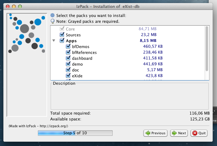 The "apps" package allows you to select or deselect a number of applications which will be installed into eXist-db when it starts the first time. If you are new to eXist-db, we recommend to at least select "dashboard", "demo", "doc", "eXide" and "fundocs". You'll need those to make your first steps in XQuery development.